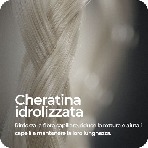 Cheratina idrolizzata: Rinforza la fibra capillare, riduce la rottura e aiuta i capelli a mantenere la loro lunghezza.