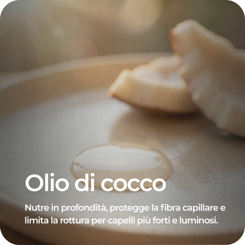 Olio di cocco: Nutre in profondità, protegge la fibra capillare e limita la rottura per lunghezze più forti e luminose.